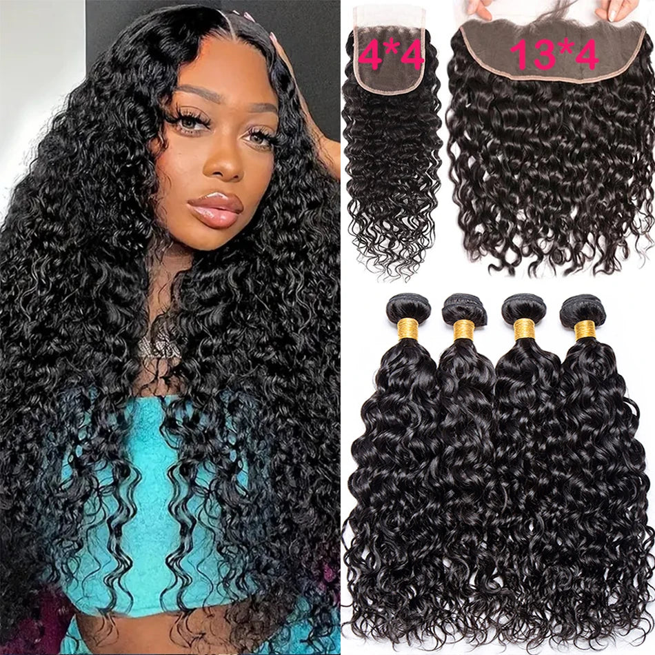 12A Brazilian Water Wave Bundles With Frontal Wet and Wavy Virgin Loose Deep Curly 100% Human Hair Bundles With Closure Tissage